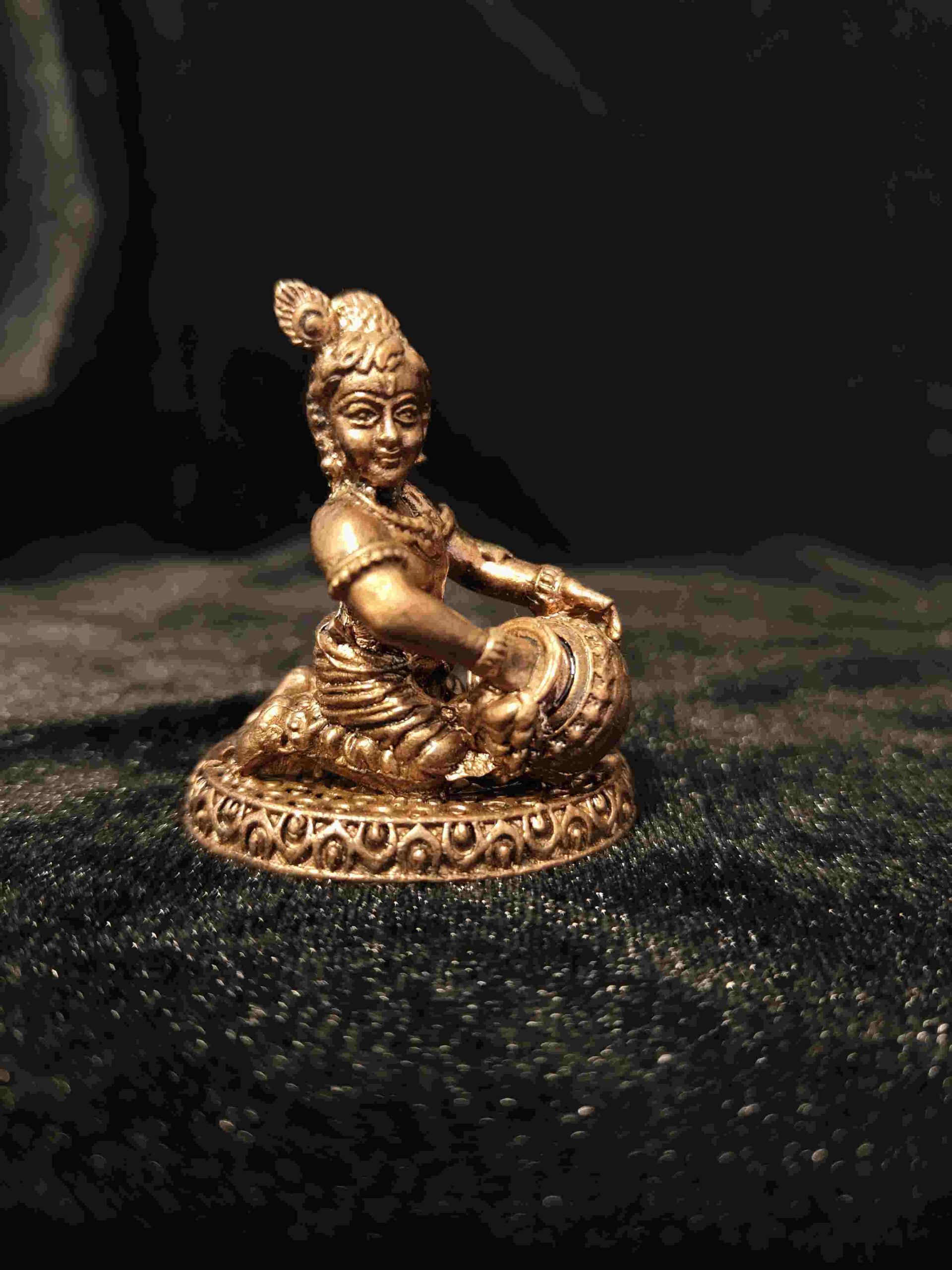 Crafted from solid copper with an antique finish, this 2-inch idol features beautiful detailing including Krishna’s expressive face, ornaments, and butter pot. The compact size makes it ideal for home altars, office desks, car dashboards, and gift purposes.